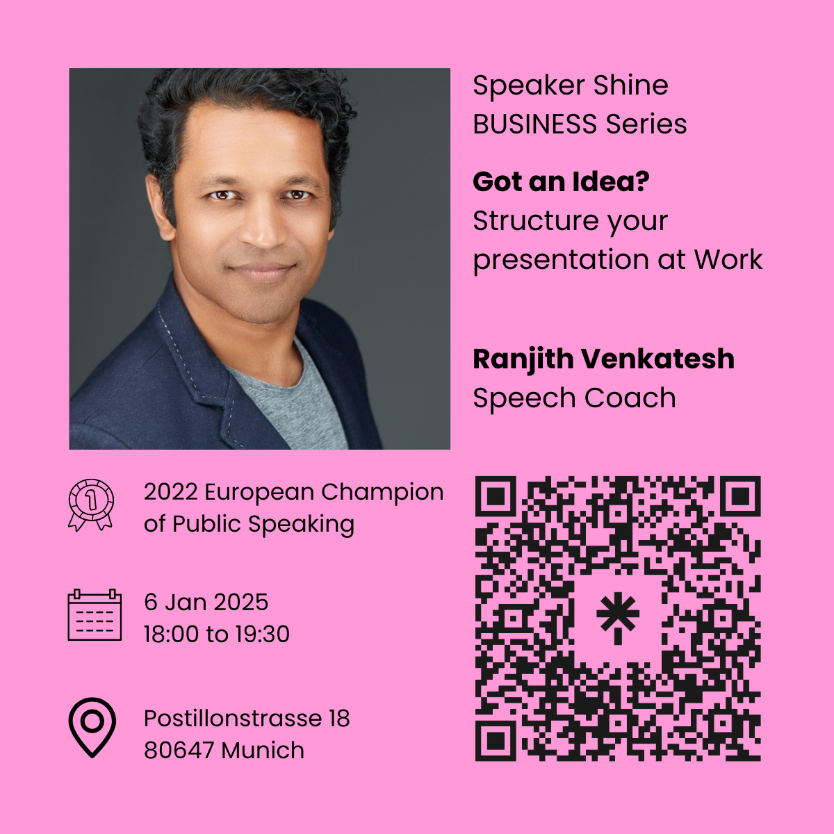 January 6, 2026 @ 6:00 pm – 7:30 pm Speaker Shine Meetup | Got an Idea? Structure your presentation Postillon Postillonstrasse 18, Munich, Bavaria, Germany €9